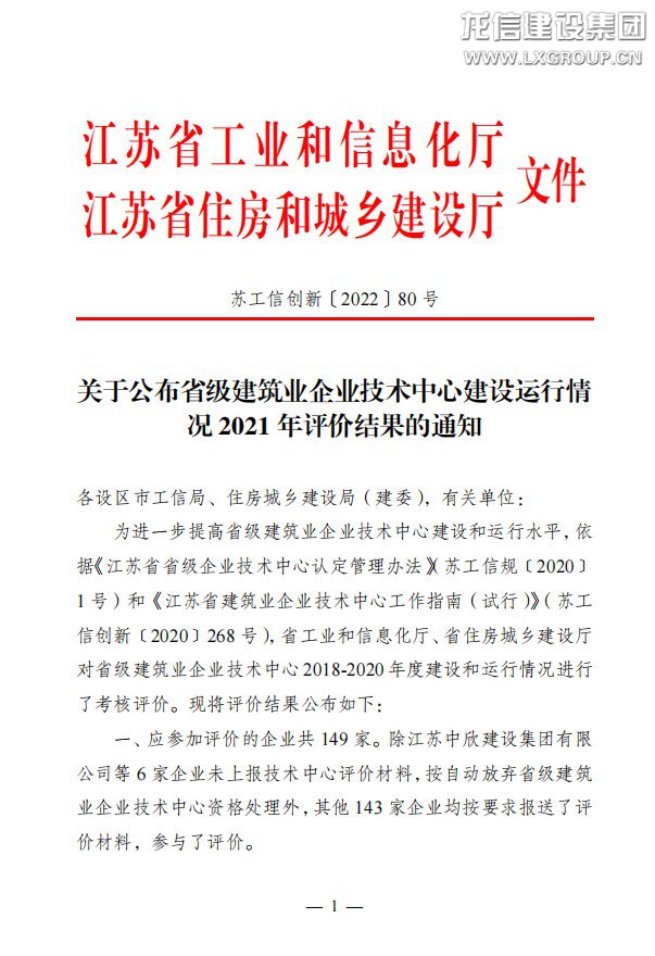 近日,江蘇省工業(yè)和信息化廳、江蘇省住房和城鄉(xiāng)建設(shè)廳印發(fā)《關(guān)于公布省級建筑業(yè)企業(yè)技術(shù)中心建設(shè)運行情況2021年評價結(jié)果的通知》(蘇工信創(chuàng)新〔2022〕80號),龍信集團獲2021年江蘇省建筑業(yè)企業(yè)技術(shù)中心“考核優(yōu)秀”的評定。本次共有149家企業(yè)參評,15家企業(yè)技術(shù)中心評價結(jié)果為優(yōu)秀。