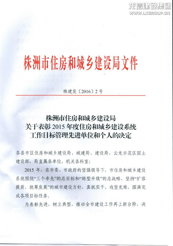 近日收到株洲市住房和城鄉建設局株建發[2016]2號文,關于表彰2015年度住房和城鄉建設系統工作管理目標先進單位和個人決定,由我公司承建的晉合湘水灣項目部獲2015年建設工程質量安全管理先進單位,工程建設方晉合置業(湖南)有限公司亦獲得2015年建設工程質量安全管理先進單位。此次獲獎是繼株洲晉合湘水灣一期高層4#、5#、6#樓被湖南省住建廳、湖南省建筑業協會評為“2013—2014年度第二批湖南省優質工程”后又一重要獎項。
