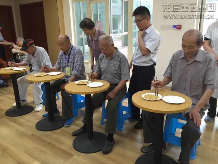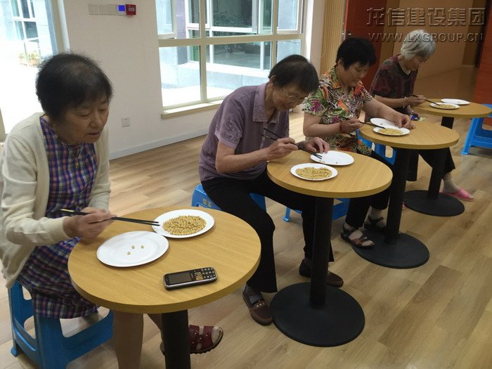 圖為叔叔阿姨正在進行筷子夾黃豆比賽