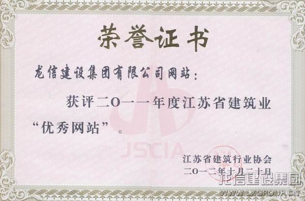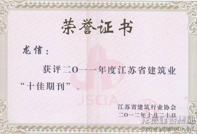 江蘇省建筑行業協會舉辦的2011年度江蘇省建筑業優秀報、刊、網和優秀通訊員評選活動,我公司《龍信》雜志和公司網站參加評選,其中《龍信》雜志被評為江蘇省建筑業十佳期刊,公司網站被評為江蘇省建筑業優秀網站。