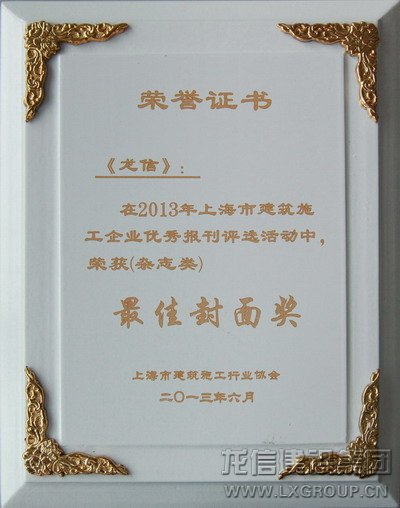 在2013年度上海市建筑施工企業(yè)優(yōu)秀報(bào)刊的評(píng)選中我公司《龍信》雜志獲評(píng)“優(yōu)秀”獎(jiǎng)和“最佳封面”獎(jiǎng),“最佳封面”獎(jiǎng)只有包括《金螳螂》在內(nèi)的3家企業(yè)雜志獲評(píng),這次獲獎(jiǎng)是繼2012年獲得上海市、江蘇省、國(guó)家行業(yè)協(xié)會(huì)獎(jiǎng)項(xiàng)后的再次獲獎(jiǎng)。