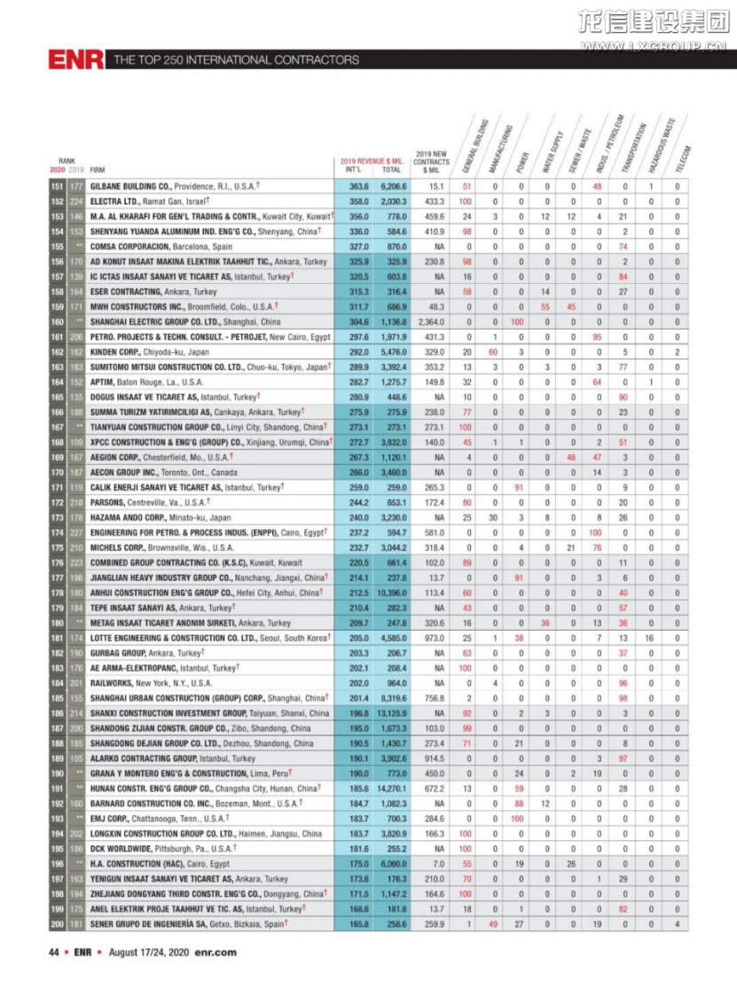 近日,美國《工程新聞紀錄(ENR)》發布了2020年度“全球最大250家國際承包商”榜單。龍信集團榮獲“全球最大250家國際承包商”第194位,較去年排名上升8位!