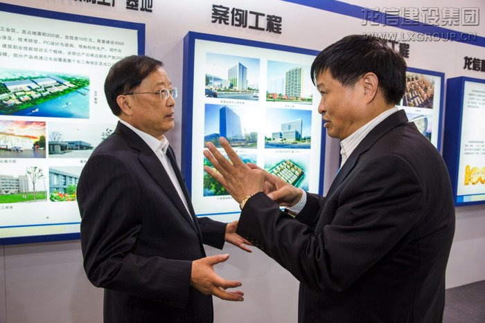 圖為陳祖新董事長向陳政高部長介紹龍信集團施工國內首個公建產業化項目沈陽“十二運”安保指揮大廈,并就龍信集團的產業化發展模式與陳政高部長進行交流。