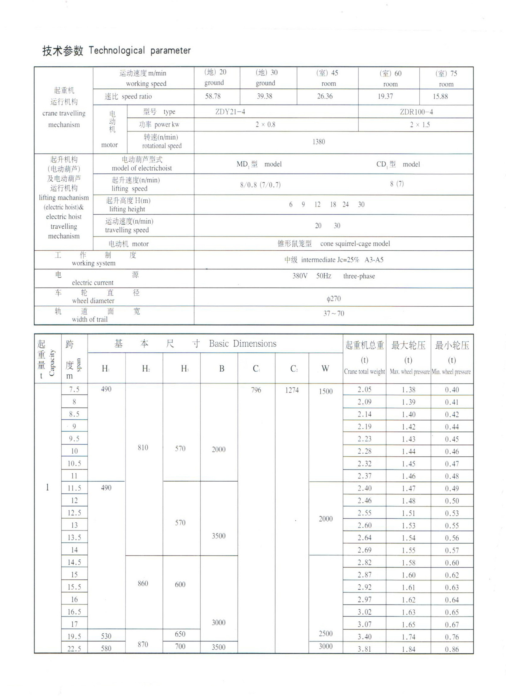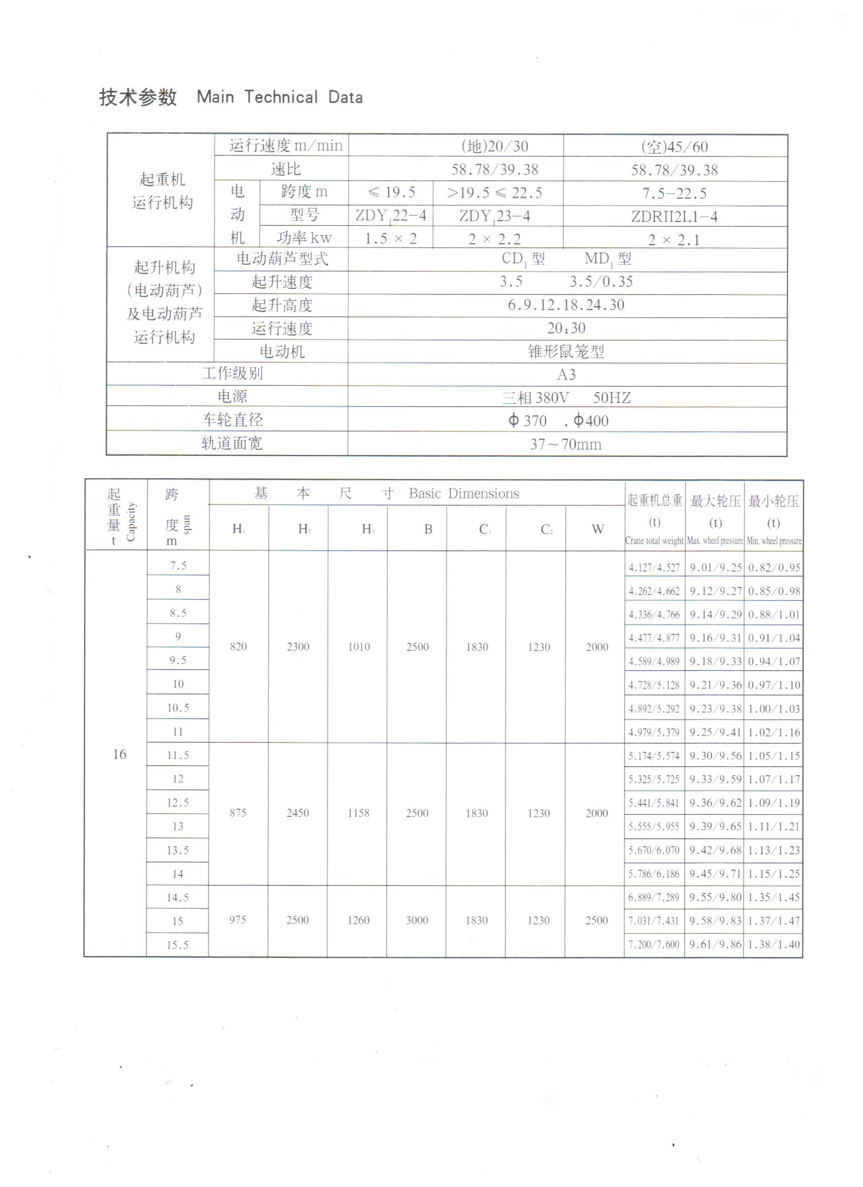 1.2.3 電氣設備 本產品所運行電機為單速異步電動機,運行速度:地面操作20m/min、30 m/min;操縱室作為45 m/min、60 m/min、75 m/min。起重機設有安全裝置,可靠性高。